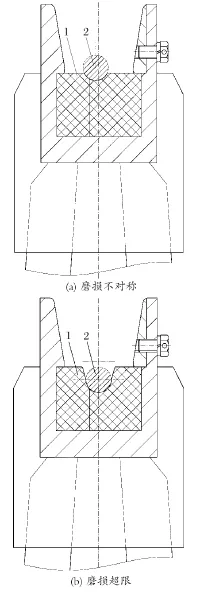 天輪裝置在返廠修復(fù)時,天輪襯墊磨損一般出現(xiàn)2 種情況 (見圖 9),襯墊磨損左右不對稱和襯墊深度方向磨損超限。分析其原因:襯墊左右磨損不對稱是因為天輪裝置與主軸裝置不對中所致;襯墊磨損嚴重直接原因是鋼絲繩與襯墊發(fā)生了相對運動,鋼絲繩打滑,輪緣偏擺較大也是原因之一。