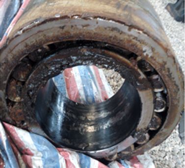 返廠修復(fù)的天輪裝置軸承座打開后,發(fā)現(xiàn)內(nèi)部多為脂水混合物,軸承內(nèi)部銹蝕嚴重,如圖8所示。在正確使用、維護及時的情況下,軸承不應(yīng)出現(xiàn)這種問題,其原因是:軸承座端蓋密封年久老化,在露天雨水的沖擊下,雨水從失效的密封處進入軸承座內(nèi)部,使得軸承潤滑不良,在重載條件下造成軸承磨損銹蝕。