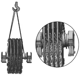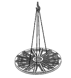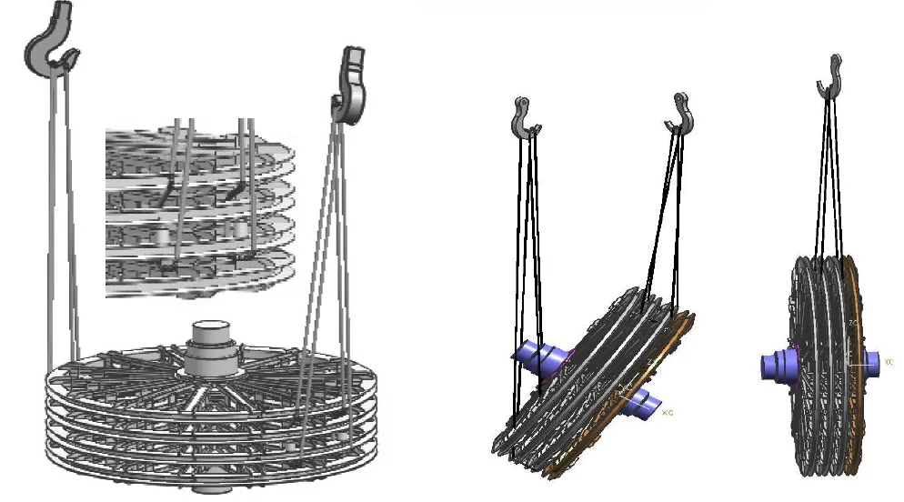 4m以下規格天輪裝置:采用兩根等長鋼絲繩。鋼繩兜吊中間兩個輪子的輪緣,兩根鋼絲繩分別掛在同一處槽鋼的左、右兩側。為防止輪子變形,兩吊掛輪子之間需用千斤頂支墊。