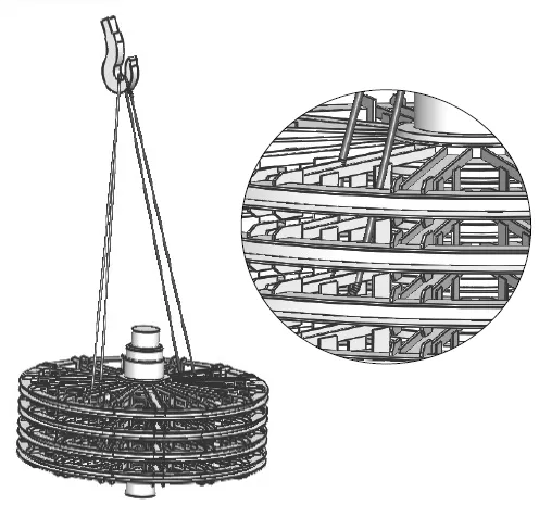 采用兩根鋼絲繩,主鉤鋼絲繩從上方腹板中一人孔穿入,繞過主軸,從同一人孔穿出。副鉤鋼絲繩通過工裝吊盤,吊在主軸上方,起輔助調平作用。主軸兩端的螺釘孔僅用于把吊具,不能直接把吊環螺釘起吊。