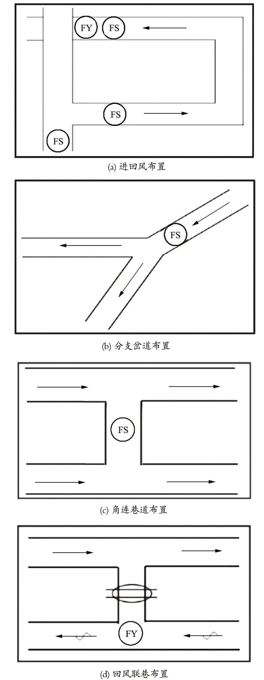 針對井下各地點作業(yè)內(nèi)容與通風(fēng)不同方式,尤其是在繞道車場、分支岔路巷道和聯(lián)絡(luò)巷等地點,需要安裝傳感器進行監(jiān)測。此外,在 Y 形和 U 形通風(fēng)方式的采煤工作面回風(fēng)流側(cè)也容易出現(xiàn)風(fēng)流不穩(wěn)定現(xiàn)象;在主要運輸大巷、掘進工作面設(shè)置有調(diào)節(jié)風(fēng)窗的風(fēng)門前后,由于運輸需要經(jīng)常開啟風(fēng)門,容易導(dǎo)致風(fēng)流擾動影響較大,產(chǎn)生局部風(fēng)速、風(fēng)壓變化。這些地點均需要安裝傳感器加強監(jiān)測。