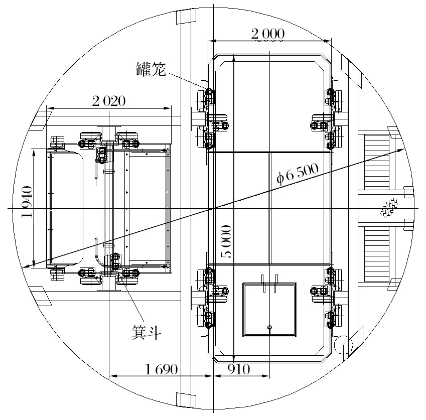 會(huì)澤礦業(yè)分公司3號(hào)豎井的井筒直徑為6.5 m,井筒布置為1臺(tái)箕斗配合1臺(tái)罐籠的混合提升方式。箕斗斷面為1 940 mm×2 0.0mm,罐籠斷面為5 0.0mm×2 0.0mm,井筒布置如圖1所示。箕斗有效容積為13 m3,zui大載重 30.35t,自重 38 t,4 根尾繩總質(zhì)量為118.39 t,因此箕斗終端載荷為186.74 t。罐籠配合箕斗提升,自重 38 t,4 根尾繩總質(zhì)量為118.39 t,罐籠采用雙層結(jié)構(gòu)。