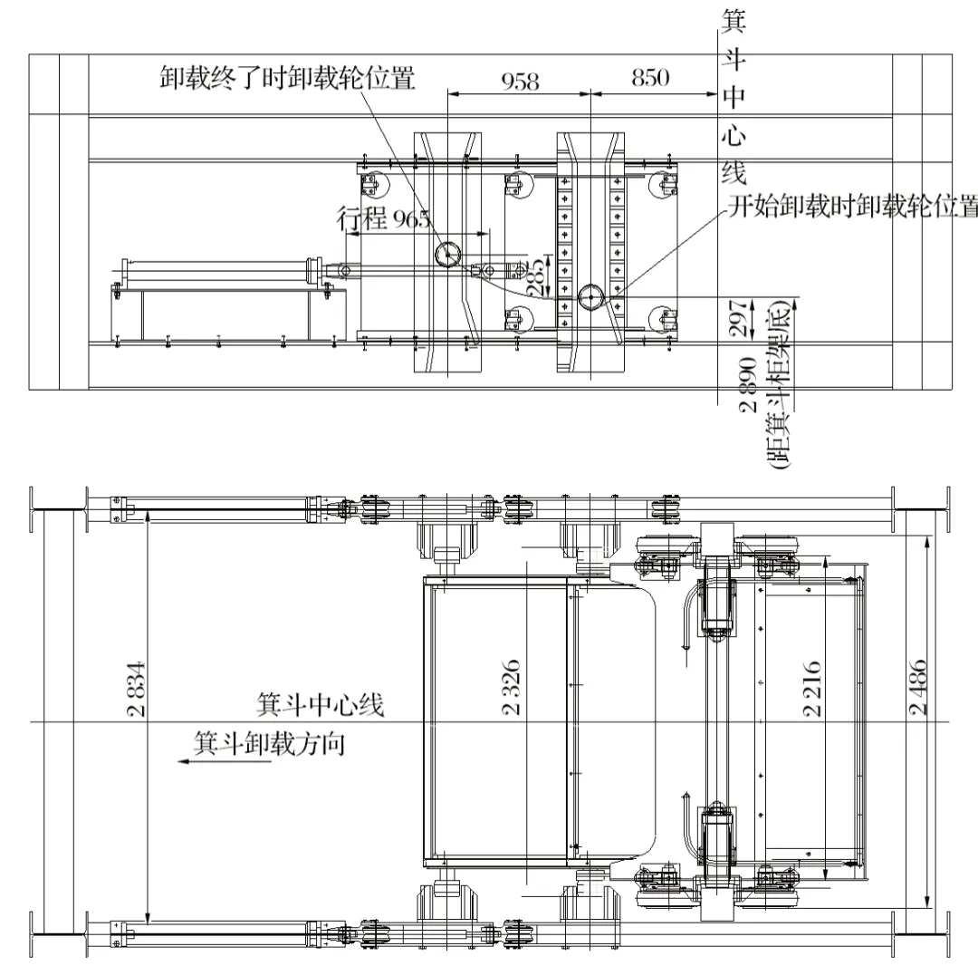 (2)這種2個卸礦點應(yīng)用在同一箕斗的卸礦方式在我國尚屬shou 次,會澤礦3號豎井是目前wei 一在用的雙卸載點礦井。一般的礦井一個井筒采用一個卸礦點,多個水平的多點卸礦一般要打多個井筒。為了多點卸礦功能的順利實現(xiàn),移動直軌到位精度偏差不能超過±5 mm,并且應(yīng)滿足鋼絲繩正常的彈性變形伸縮量的卸載要求。多點卸礦為礦山開采節(jié)約了大量成本,移動直軌卸載裝置如圖2所示。