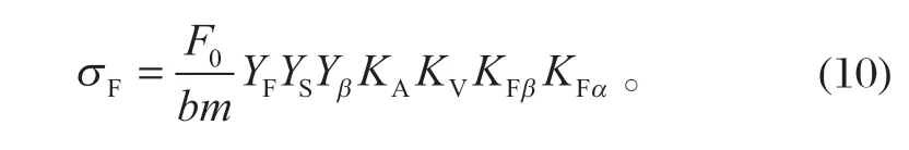 式中:YF 為齒廓系數(shù),YF=1;YS 為應(yīng)力修正系數(shù),YS=1;KA 為使用系數(shù),KA=1.25;KV 為動載系數(shù),KV=1;KFβ 為螺旋分布系數(shù),KFβ=1;KFα 為載荷分布系數(shù),KFα=1。將各數(shù)據(jù)代入式(10),可得齒根彎曲應(yīng)力為100.42MPa。