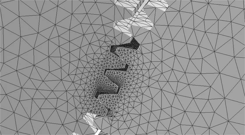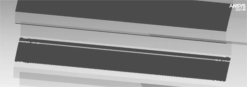 在 SolidWorks 中對同步齒輪進(jìn)行建模并調(diào)整,確保同步齒輪不會出現(xiàn)干涉。為了提高仿真精度和數(shù)據(jù)的可靠性,對靜強(qiáng)度仿真過程中參與嚙合的幾對輪齒表面網(wǎng)格化。齒面網(wǎng)格細(xì)化模型如圖5所示。