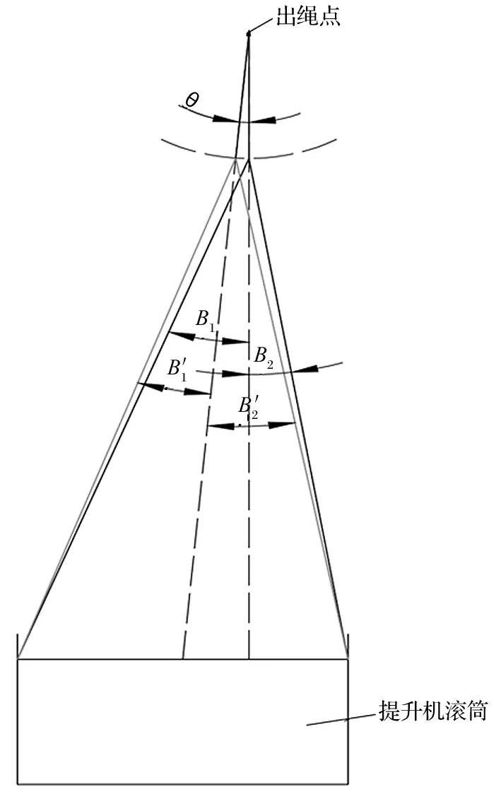 3 結(jié)語(yǔ) 礦井提升機(jī)的鋼絲繩偏角問(wèn)題是影響提升系統(tǒng)鋼絲繩安全運(yùn)行的重要因素之一,如果鋼絲繩偏角過(guò)大,將加大鋼絲繩與天輪輪緣的磨損,降低鋼絲繩的使用壽命,磨損嚴(yán)重時(shí),甚至還會(huì)發(fā)生斷繩事故,造成不可挽回的損失。