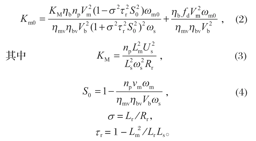 式中:np 為電動機的極對數(shù);Vm 為液壓馬達的排量;ωs 為電網(wǎng)供電頻率;Ls、Lr、Lm 分別為定子電感、轉(zhuǎn)子電感以及定子與轉(zhuǎn)子之間的互感;Us 為端電壓。