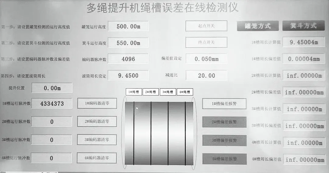 繩槽誤差在線檢測報警裝置的功能:①旋轉編碼器測量卷筒的周長,將繩槽直徑放大 3.14 倍,如果運行 50 圈,相當于放大了 157 倍,準確性高,存儲系統對測距數值進行存儲;②PLC 記數運算裝置具有比較功能,繩槽誤差超過要求時,顯示器上會出現報警畫面,及時提醒提升機管理員進行調繩,避免出現提升事故;③其余數據信息通過顯示器進行動態顯示,可以直觀了解每根鋼絲繩的運行速度,每個繩槽的直徑誤差,易于發現繩槽磨損規律,提高檢查及檢修的工作效率。繩槽誤差監控應用如圖1 所示,繩槽誤差監控軟件報警界面如圖2 所示,提升機卷筒直徑計算界面如圖3 所示。